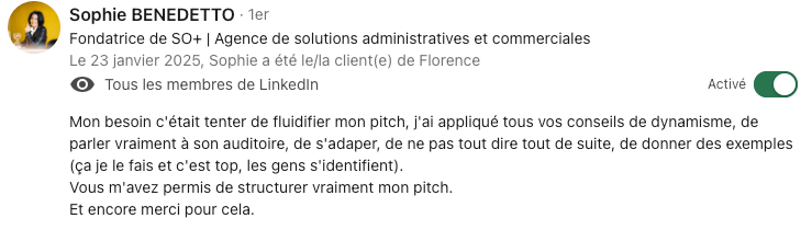 Merci pour ton énergie et la personne que tu es. Tu as su me transmettre les clefs pour réussir la prise de parole sur les réseaux car ça y est, j'ai sorti mon 1er reel filmé ! J'ai réussi à faire l'exercice aisément et sans perdre trop de temps. Donc merci !
